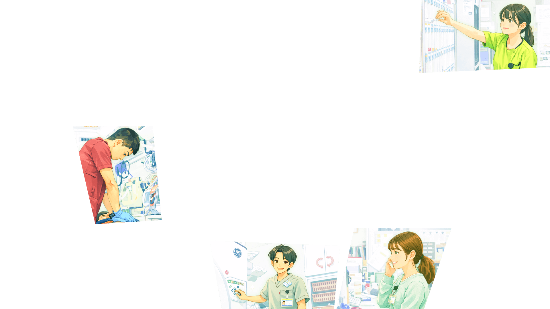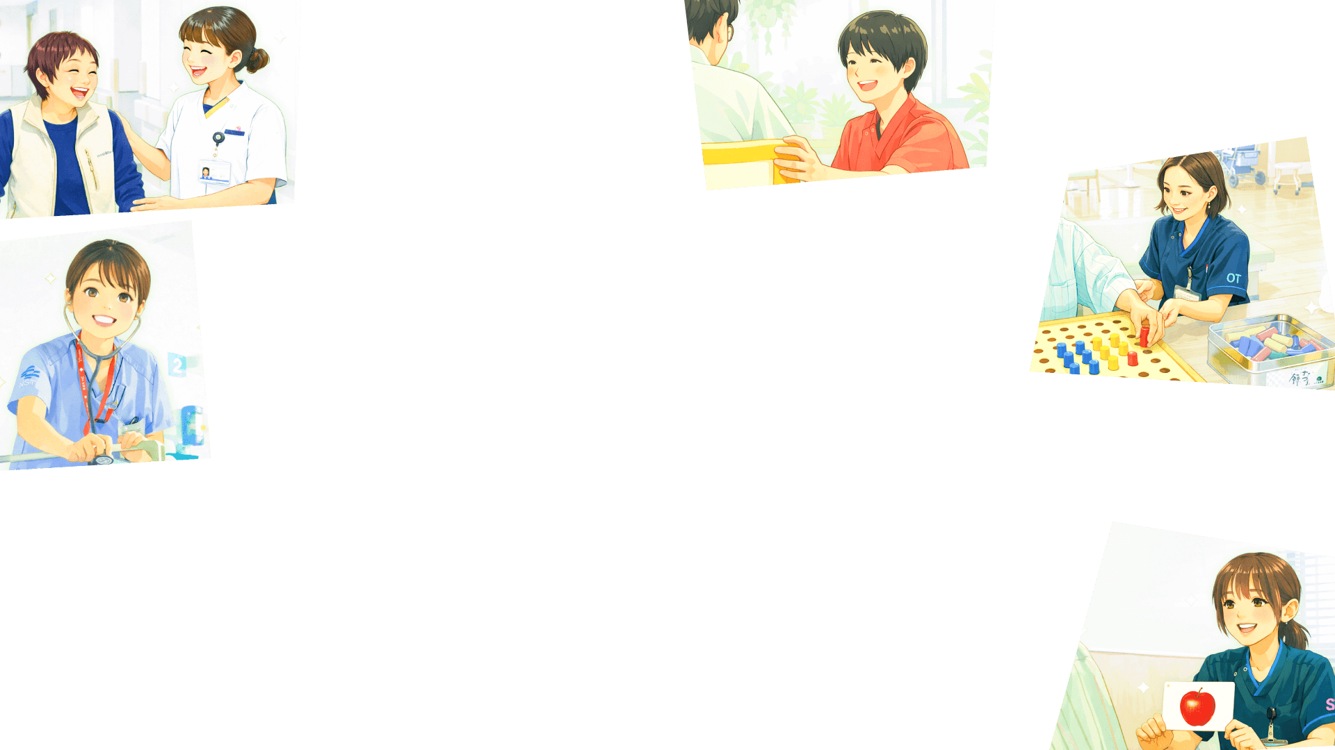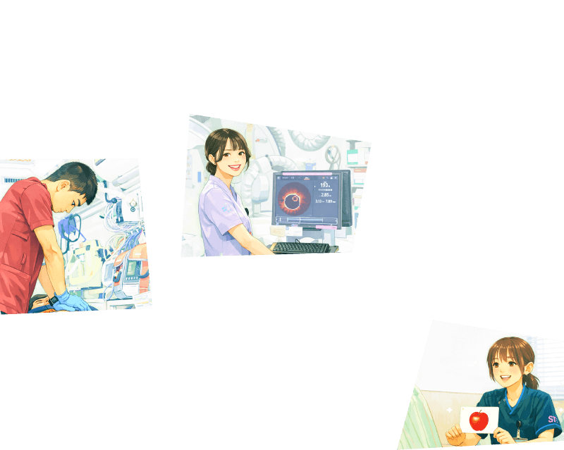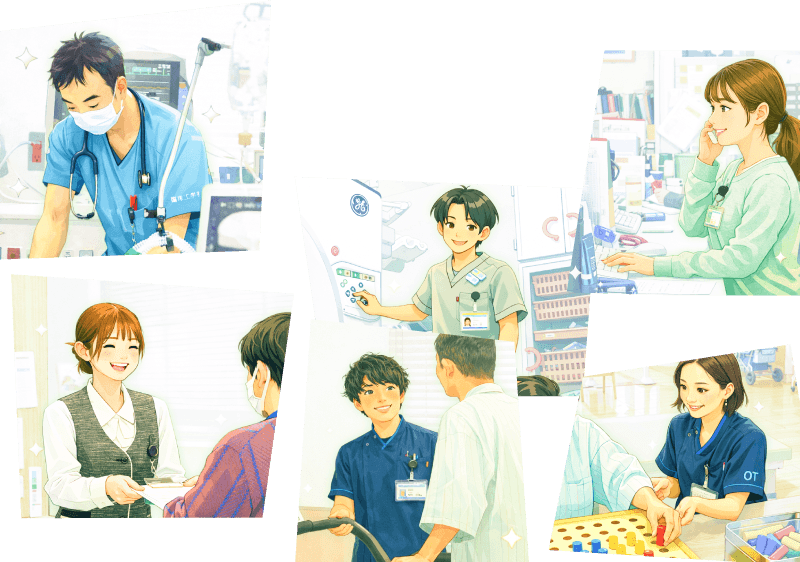 看護師、薬剤師、管理栄養士、臨床検査技師、理学療法士、作業療法士、言語聴覚士、臨床工学技士、診療放射線技師、ソーシャルワーカー、介護福祉士、救急救命士、事務