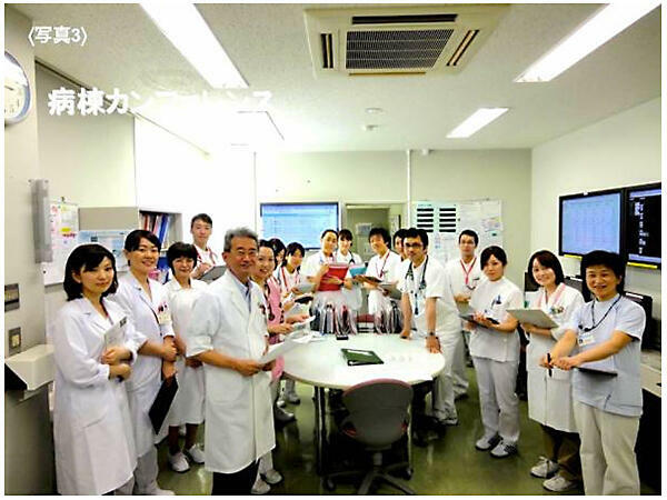 当院の栄養サポートの主体は病棟配属型レゴ型のチーム医療⁽²⁾ (図1)(写真1)で、病棟に配属された管理栄養士が電子カルテによる情報交換で情報を共有し、業務の標準化で質を保ち、栄養サポートが必要な患者すべてに対応しています。このチーム医療の特徴は、管理栄養士中心のNSTであることと、対象患者は標準偏差内の対応しやすい患者さんで、当院の場合、高齢のために低栄養になる患者が多く、NST対象の中で95%を占めています。効率的なチーム医療を展開することで、年間3,568名の患者にNSTが介入しており、NST加算も毎月600~800件算定しています。栄養サポートが必要な患者すべてに行なわれることから、輸液や抗生剤が減少し、食事が増加するなど、病院の医療が変わると共に、重症病棟では末梢輸液から経腸栄養に切り替わり、病棟の景色が変わるなど大きな変化が出ています。標準偏差外の病態の難しい残りの5%の患者に対しては、医師中心で専門部隊型もたれあい型のチーム医療(写真2)を行なっています。このチーム医療は、能力の高い多職種がカンファレンスで擦り合わせをして情報を共有するため、チーム医療の質は高いが処理能力には限りがあり、病棟に配属された管理栄養士では対応できない病態の難しい事例を対象とすると共に、新人の管理栄養士や研修生に対する教育カンファレンスの意味も持たせています。(写真3)