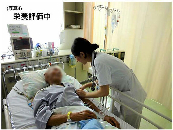 真のチーム医療は、少ないスタッフで点数を取るためだけのチーム医療でもありませんし、なんとなく多職種が集まって趣味的にやっているチーム医療でもありません。多くの専門職が機能を絞り込んでコア業務に特化することで、労働生産性が高まり、医療の質の向上と効率化を進めることができます。栄養サポートも栄養の専門職である管理栄養士が機能を絞り込み、患者の栄養管理というコア業務に特化することが求められます。その業務は、①栄養リスクのある患者に接して、直接一次情報を取る(問診)、②お腹を触り腸音を聴く(理学所見を取る)、③栄養評価を行う(写真4)(栄養学的に診断する)、④栄養プランを作る(栄養学的に治療プランを作る)、⑤①~④を電子カルテに記載し担当医師と相談、承認を得て看護師と共に栄養サポートを行なう(栄養学的に治療を行なう)、というように、医師の診断、治療の業務と同様に栄養学的に診断、治療を行なうことになります。食事という物のサービスを提供することから、管理栄養士自身が患者を栄養学的に治す時代になったといえます。