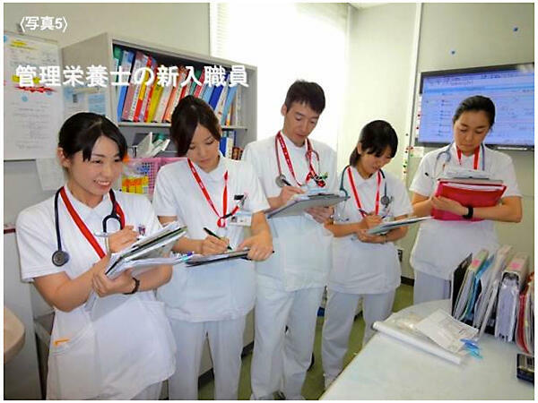 当院では、管理栄養士がメディカルスタッフになるために2段階の教育システムで教育を行なっています。第1段階は、院長、各病棟のNST担当部長のラウンドやカンファレンスを通じて、メディカルスタッフになるための教育を行なっています。当院では栄養の専門医がいなかったため、自然発生的にこのようなシステムとなっています。普通の医師が管理栄養士をメディカルスタッフにするために医療人としての常識を叩き込んでいます。まず、姿勢や笑顔、声の出し方、コミュニケーションといった立ち居振る舞いが大事で、厨房のねえちゃん、にいちゃんから、病棟のメディカルスタッフにふさわしい姿が求められます。2番目には、医療人としての常識として共通言語としての医療用語、これは電子カルテと略語集が役に立ちます。検査データは、基本的な血算、生化学、検尿、動脈ガスなどのデータで十分病態が把握できます。画像は、胸部の単純XPで、心臓の大きさや肺の鬱血、胸水などで水分の多い少ないが分かりますし、腹部のガス像でお腹の具合を推し量ることができます。CTスキャンもパターン認識ですので、見慣れるにつれ、病態と関連付けれるようになります。また、共通概念として栄養サポートをする際に直接的に役に立つ、栄養に直結する病態の把握とその重要度が大事になります。主に臓器不全や敗血症、脱水、ショック、DICといった病態で、まず、口から食べれるかどうか、腸が使えるかどうか、腸が使えない場合は経静脈栄養を考えてください。三種類の鉄砲(経口、経腸、経静脈栄養)が決まれば、水分、カロリー、蛋白の順で必要量を考え、弾丸を選択してください。幸い、何千種類とある薬剤と違って栄養は簡単で、普段使う弾は5、6種類、特殊な弾を含めても10種類ぐらいのものです。何はともあれ、難しい知識を追い求めて深い森に踏み込む前に、簡単で基本的な知識でいいので幅広くつながった生きた知識、生まれてからずっと口から食べてきた人間としての常識が栄養サポートには役に立ちます。3番目には、医療人としての倫理観、難しいことではなく、栄養サポートを通じてこの患者さんをよくしたいという気持ちが大切で、人間としての共感を持つためにも必要になります(写真5)。