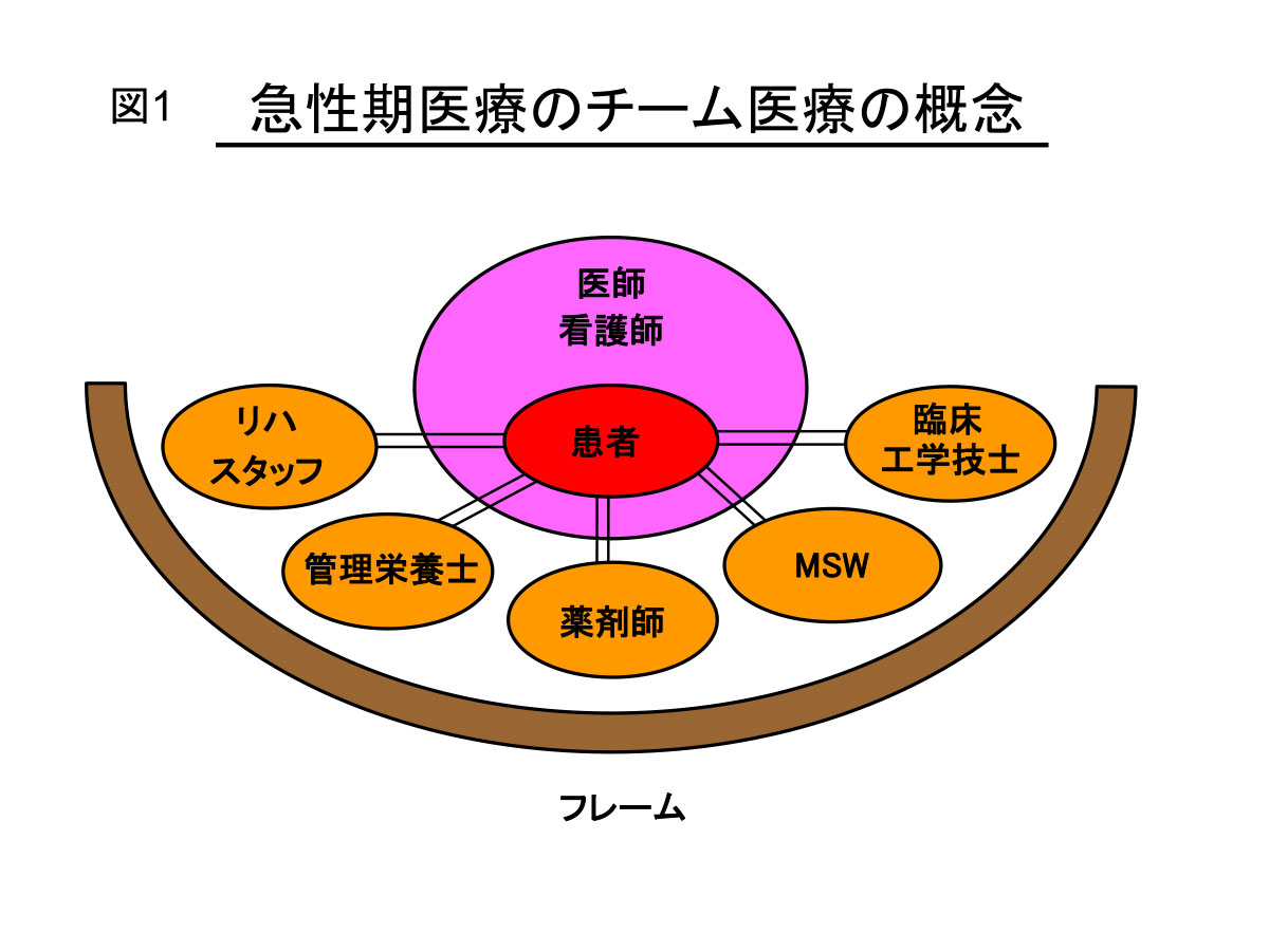 近森病院ではひとりひとりが違っている患者に対し、「フレーム」(枠組み)という概念で急性期のチーム医療を構築し良好なアウトカムを出している。具体的には自律、自働する多職種を病棟に常駐させ、電子カルテで情報共有し、必要な患者すべてに必要な業務をリアルタイムに提供している。