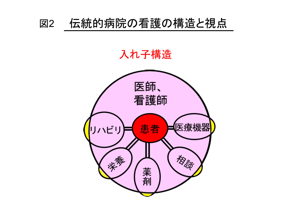 (1)伝統的病院の看護は「入れ子構造」であり、優秀な看護師が個々の患者の「患者特性」(暗黙知)を看護判断し病棟業務の多彩な業務に対応している。看護師が病棟業務のすべてを行っている為、業務の切り分けは困難で痛みを伴う。多職種はそれぞれの部署で医師の指示のもと業務を行っており、入れ子構造の外側の部分(黄色で表示)に当る(図2)。現実的には病棟常駐型チーム医療への移行中の病院も多い為、中間的な構造をとっている病院も多い。