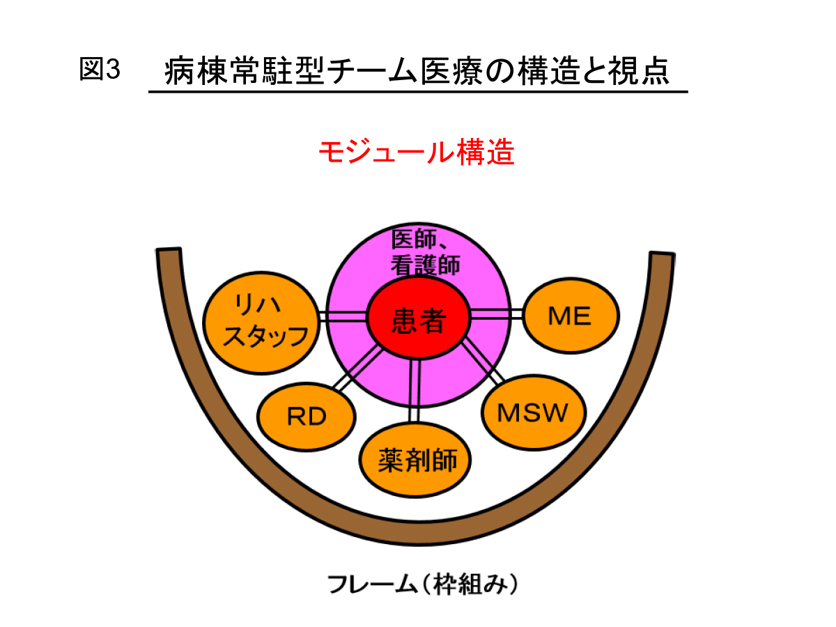 日本の医療界ではチーム医療というと、各部署で業務を行っている多職種が週に1回病棟に集まりカンファレンスですり合わせをして情報共有するチーム医療のみがチーム医療と認識されているが、医師をはじめとした多職種が同一時間に集まらないといけないし、カンファレンスですり合わせして情報共有するため時間もかかり処理患者数が限られる。その為、このタイプのチーム医療は限られたリスクの高い患者に対する質の高いチーム医療になるが、高齢患者の多くが必要とするリハビリや栄養サポートには対応できない。