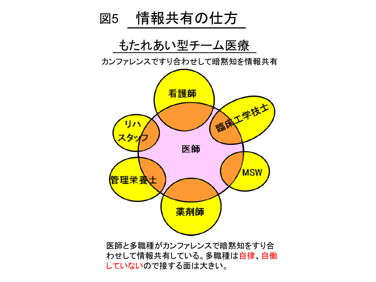 暗黙知なのでカンファレンスですり合わせをして情報共有するインテグラル型(すり合わせ型)チーム医療は、カンファレンスで医師に依存している(もたれている)ため、質の高いチーム医療となり、当院では「もたれあい型チーム医療」と呼んでいる。