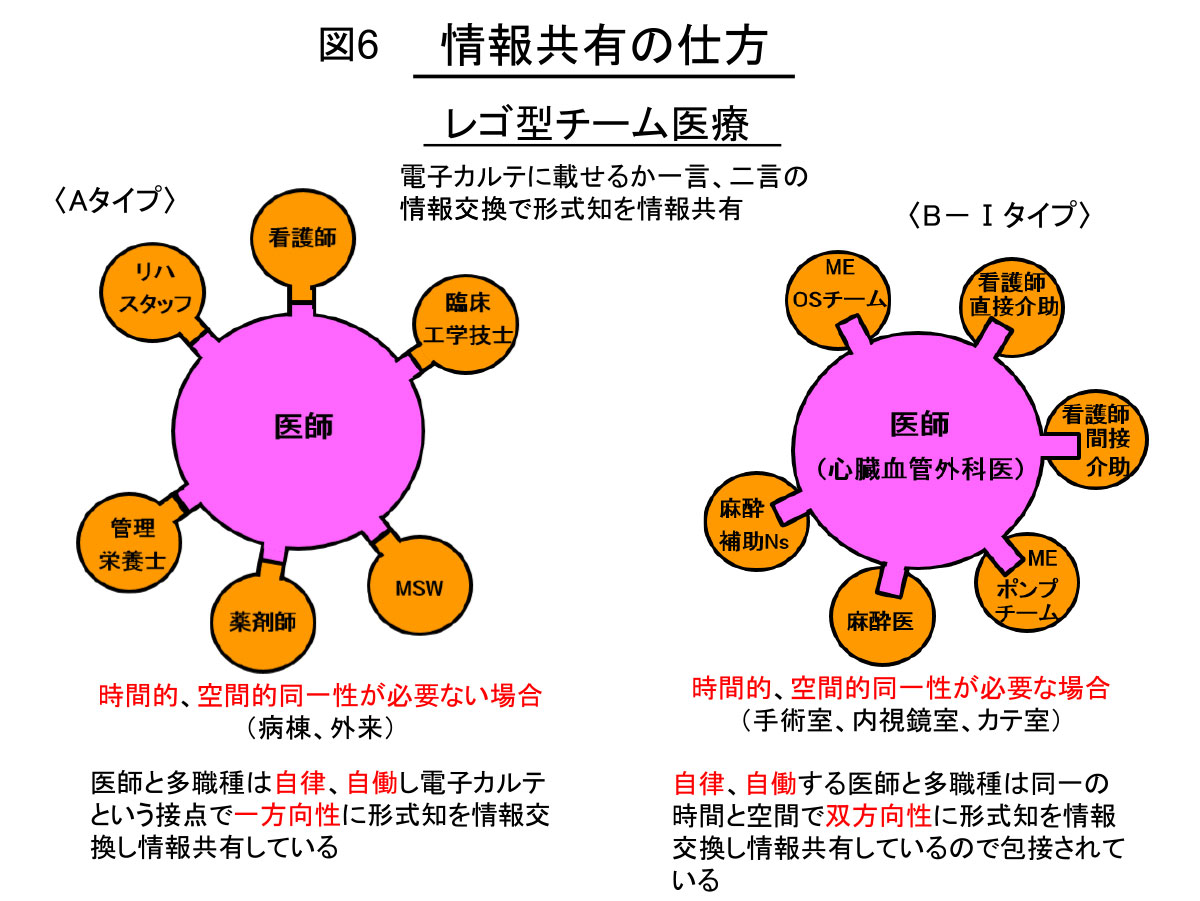 電子カルテに載せるか、一言、二言の情報交換で形式知を情報共有しており、ICT時代の情報共有といえる。病棟や外来など時間的、空間的同一性が必要ない場合(Aタイプ)と手術室や内視鏡室、カテ室のように時間的、空間的同一性が必要な場合(B-Ⅰタイプ)の2つのタイプに分けられる。