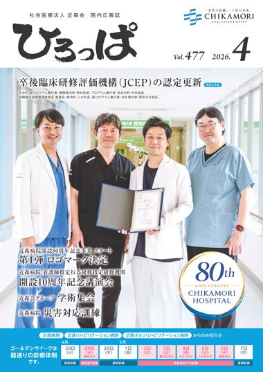 近森会グループでは、院内誌を月1回発行しています。“みんなが集まってワイワイと遊んだひろっぱのような情報交換の場を”、との思いから1986年に誕生しました。最新治療から職員の意外な素顔まで多彩な内容が詰まった、近森の”今”をお届けします。 ひろっぱ最新号 2026年4月 バックナンバー 2026年 2026年3月 2026年2月 2026年1月 2025年 2025年12月 2025年11月 2025年10月 2025年9月 2025年8月 2025年7月 2025年6月 2025年5月 2025年4月 2025年3月 2025年2月 2025年1月 2024年 2024年12月 2024年11月 2024年10月 2024年9月 2024年8月 2024年7月 2024年6月 2024年5月 2024年4月 2024年3月 2024年2月 2024年1月 2023年 2023年12月 2023年11月 2023年10月 2023年9月 2023年8月 2023年7月 2023年6月 2023年5月 2023年4月 2023年3月 2023年2月 2023年1月 2022年 2022年12月 2022年11月 2022年10月 2022年9月 2022年8月 2022年7月 2022年6月 2022年5月 2022年4月 2022年3月 2022年2月 2022年1月 2021年 2021年12月 2021年11月 2021年10月 2021年9月 2021年8月 2021年7月 2021年6月 2021年5月 2021年4月 2021年3月 2021年2月 2021年1月 2020年 2020年12月 2020年11月 2020年10月 2020年9月 2020年8月 2020年7月 2020年6月 2020年5月 2020年4月 2020年3月 2020年2月 2020年1月 2019年 2019年12月 2019年11月 2019年10月 2019年9月 2019年8月 2019年7月 2019年6月 2019年5月 2019年4月 2019年3月 2019年2月 2019年1月 2018年 2018年12月 2018年11月 2018年10月 2018年9月 2018年8月 2018年7月 2018年6月 2018年5月 2018年4月 2018年3月 2018年2月 2018年1月 2017年 2017年12月 2017年11月 2017年10月 2017年9月 2017年8月 2017年7月 2017年6月 2017年5月 2017年4月 2017年3月 2017年2月 2017年1月 2016年 2016年12月 2016年11月 2016年10月 2016年9月 2016年8月 2016年7月 2016年6月 2016年5月 2016年4月 2016年3月 2016年2月 2016年1月 2015年 2015年12月 2015年11月 2015年10月 2015年9月 2015年8月 2015年7月 2015年6月 2015年5月 2015年4月 2015年3月 2015年2月 2015年1月 2014年 2014年12月 2014年11月 2014年10月 2014年9月 2014年8月 2014年7月 2014年6月 2014年5月 2014年4月 2014年3月 2014年2月 2014年1月 2013年 2013年12月 2013年11月 2013年10月 2013年9月 2013年8月 2013年7月 2013年6月 2013年5月 2013年4月 2013年3月 2013年2月 2013年1月 2012年 2012年12月 2012年11月 2012年10月 2012年9月 2012年8月 2012年7月 2012年6月 2012年5月 2012年4月 2012年3月 2012年2月 2012年1月 2011年 2011年12月 2011年11月 2011年10月 2011年9月 2011年8月 2011年7月 2011年6月 2011年5月 2011年4月 2011年3月 2011年2月 2011年1月 2010年 2010年12月 2010年11月 2010年10月 2010年9月 2010年8月 2010年7月 2010年6月 2010年5月 2010年4月 2010年3月 2010年2月 2010年1月 2009年 2009年12月 2009年11月 2009年10月 2009年9月 2009年8月 2009年7月 2009年6月 2009年5月 2009年4月 2009年3月 2009年2月 2009年1月 2008年 2008年12月 2008年11月 2008年10月 2008年9月 2008年8月 2008年7月 2008年6月 2008年5月 2008年4月 2008年3月 2008年2月 2008年1月 2007年 2007年12月 2007年11月 2007年10月 2007年9月 2007年8月 2007年7月 2007年6月 2007年5月 2007年4月 2007年3月 2007年2月 2007年1月 2006年 2006年12月 2006年11月 2006年10月 2006年9月 2006年8月 2006年7月 2006年6月 2006年5月 2006年4月 2006年3月 2006年2月 2006年1月 2005年 2005年12月 2005年11月 2005年10月 2005年9月 2005年8月 2005年7月 2005年6月 2005年5月 2005年4月