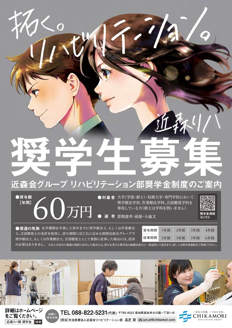 この奨学金は近森会グループにおいて、将来、理学療法士、作業療法士、言語聴覚士として業務に従事しようとする者に対し、学業に専念し人間性豊かな学生生活をおくれるよう支援するために設けられた奨学制度です。