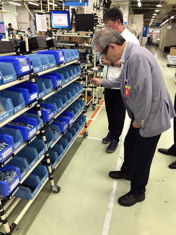 世界のGEのCT組み立て工場なのでロボットが活躍する自動工場を想像しながら訪問させて頂いた。工場内に一歩足を踏み入れてまず驚いたことはビニールパイプやローラーを使って手作りで枠組みを作り、滑車や重力の原理を利用して電動でなく「からくり」で重い部品を上げたり遠くに移動させたりして業務を改善したり、取り付ける部品やネジをきちんと工程ごとにセッティングして効率よく確実に組み立てを行っている現場のスタッフの地道な努力でした。そうしたアナログの手作りの改善の後、センサーを導入しスタッフの動線や滞留をチェックしてシステムとして、それこそ乾いた雑巾を絞るような種々の「KAIZEN」を行っていました。