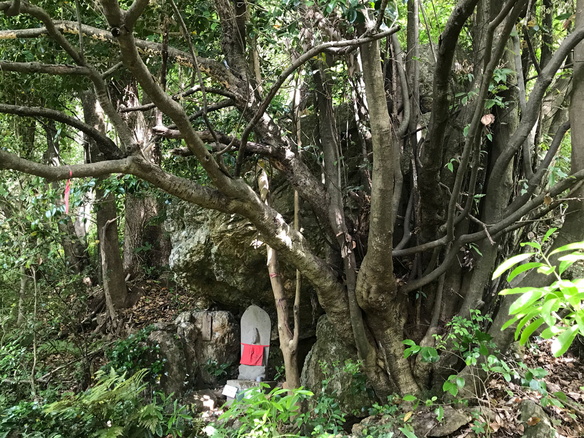 五台山は古くは浦戸湾に浮かぶ大島であった(※因みに浦戸湾七島は「大島」、葛島、田辺島、比島、洞ヶ島、竹島、玉島で、現在は玉島だけが湾内にある)。江戸後期文政2年(1819年)、四国八十八カ所のご本尊が、ここ五台山の岩陰や木立のそばに石仏として祀られ、その石仏を巡るおよそ10㌔に及ぶ遍路道がいまも遺っている。ここを一巡すると、四国八十八カ所を全部回ったと同じご利益を授かるというので、ミニ八十八カ所巡りを開始。インターネットで調べてみたが詳細な地図が見つからなかったので、ぶっつけ本番で歩き始めた。