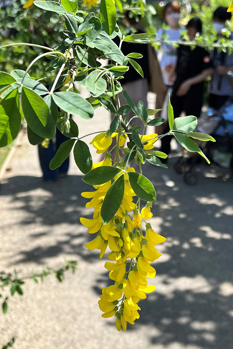 休憩スペースの上にはさくら色の藤が日影を作っています。