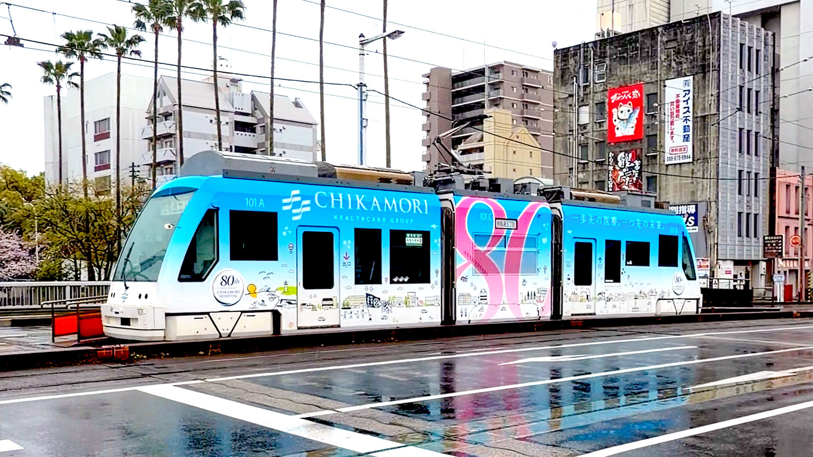 この度、近森病院の開設80周年を記念して車体に「80周年記念ロゴマーク」をあしらった特別デザインバージョンでの走行を開始しました。高知の街を走る青い電車が、感謝の気持ちを乗せて皆さまのもとへ走り出します。